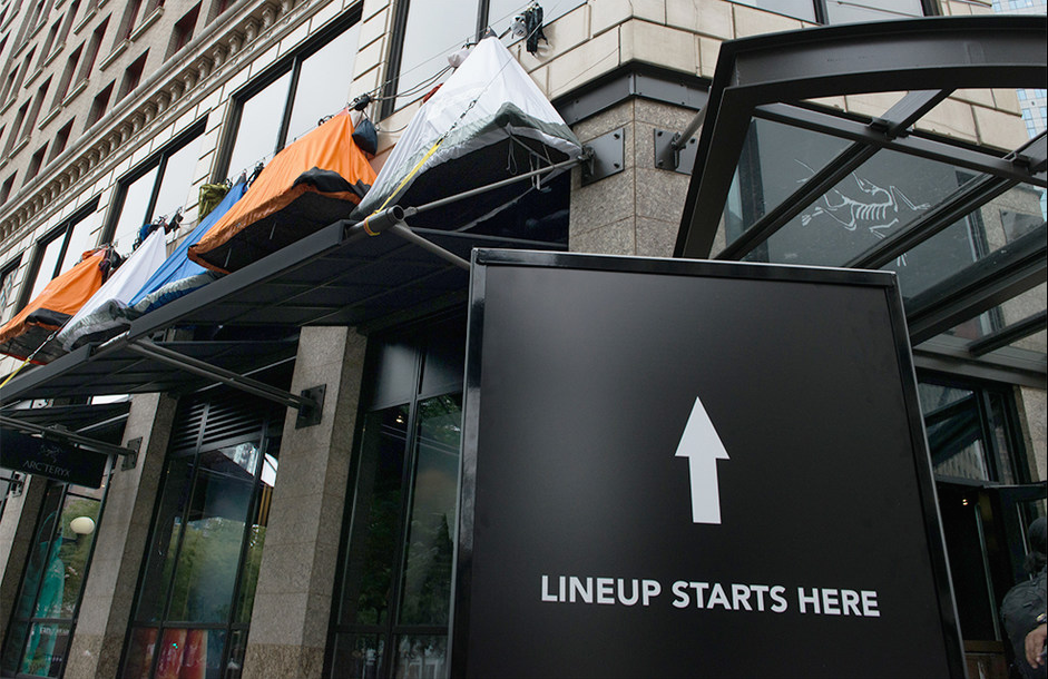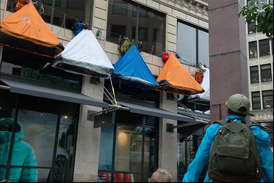 For the grand opening of their first US brand store, Arc’teryx took the traditional store camp-out and put it 40 feet off the ground – complete with authentic portaledge tents and climbing gear